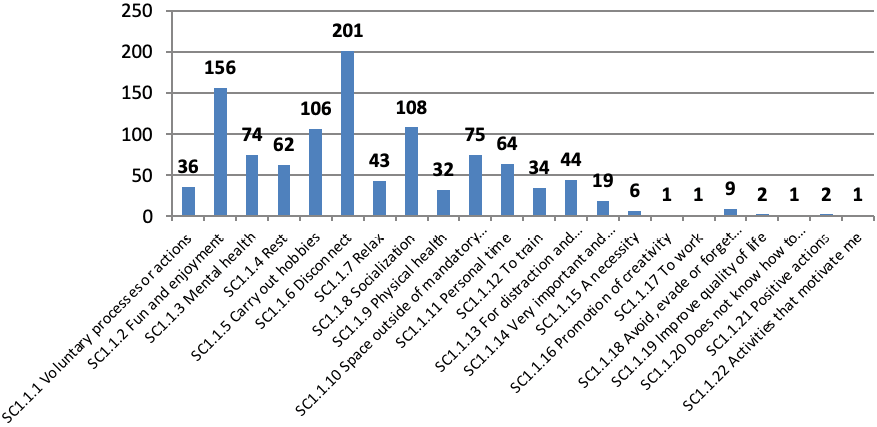 SC1.1.1 Voluntary processes or actions SC1.1.2 Fun and enjoyment SC1.1.3 Mental health SC1.1.4 Rest SC1.1.5 Carry out hobbies SC1.1.6 Disconnect SC1.1.7 Relax SC1.1.8 Socialization SC1.1.9 Physical health SC1.1.10 Space outside of mandatory or routine tasks SC1.1.11 Personal time SC1.1.12 To train SC1.1.13 For distraction and entertainment SC1.1.14 Very important and fundamental SC1.1.15 A necessity SC1.1.16 Promotion of creativity SC1.1.17 To work SC1.1.18 Avoid, evade or forget problems and worries SC1.1.19 Improve quality of life SC1.1.20 Does not know how to define it SC1.1.21 Positive actions SC1.1.22 Activities that motivate me |
