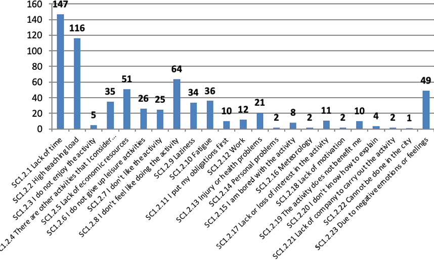 SC1.2.1 Lack of time SC1.2.2 High teaching load SC1.2.3 I do not enjoy the activity SC1.2.4 There are other activities that I consider more important SC1.2.5 Lack of economic resources SC1.2.6 I do not give up leisure activities SC1.2.7 I don’t like the activity SC1.2.8 I don’t feel like doing the activity SC1.2.9 Laziness SC1.2.10 Fatigue SC1.2.11 I put my obligations first SC1.2.12 Work SC1.2.13 Injury or health problems SC1.2.14 Personal problems SC1.2.15 I am bored with the activity SC1.2.16 Meteorology SC1.2.17 Lack or loss of interest in the activity SC1.2.18 Lack of motivation SC1.2.19 The activity does not benefit me SC1.2.20 I don’t know how to explain SC1.2.21 Lack of company to carry out the activity SC1.2.22 Cannot be done in the city SC1.2.23 Due to negative emotions or feelings |