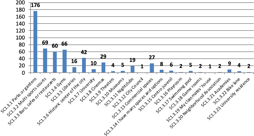 SC1.3.1 Parks or gardens SC1.3.2 Multi-sports courts SC1.3.3 Bars, cafes or restaurants SC1.3.4 Gyms SC1.3.5 Libraries SC1.3.6 Historic center of the city SC1.3.7 University SC1.3.8 Cinemas SC1.3.9 theatres SC1.3.10 Museums SC1.3.11 Nightclubs SC1.3.12 City Council SC1.3.13 Commercial spaces SC1.3.14 I have many spaces and options SC1.3.15 Youth Center SC1.3.16 Playroom SC1.3.17 Swimming pool SC1.3.18 Game rooms SC1.3.19 My classmates’ house SC1.3.20 Neighborhood Association SC1.3.21 Academies SC1.3.22 Bike lane SC1.3.23 University residence |