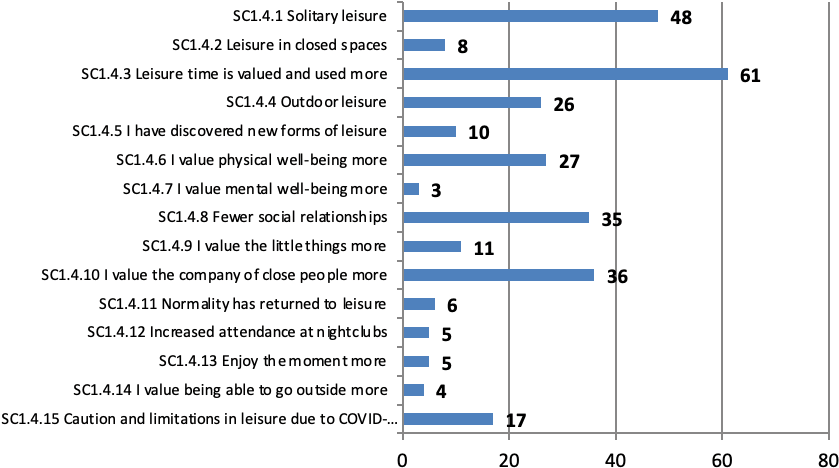 SC1.4.1 Solitary leisure SC1.4.2 Leisure in closed spaces SC1.4.3 Leisure time is valued and used more SC1.4.4 Outdoor leisure SC1.4.5 I have discovered new forms of leisure SC1.4.6 I value physical well-being more SC1.4.7 I value mental well-being more SC1.4.8 Fewer social relationships SC1.4.9 I value the little things more SC1.4.10 I value the company of close people more SC1.4.11 Normality has returned to leisure SC1.4.12 Increased attendance at nightclubs SC1.4.13 Enjoy the moment more SC1.4.14 I value being able to go outside more SC1.4.15 Caution and limitations in leisure due to COVID-19 |