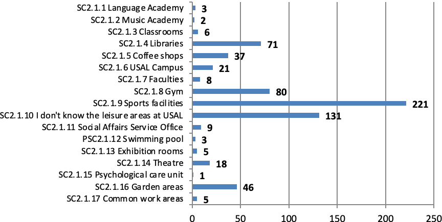 SC2.1.1 Language Academy SC2.1.2 Music Academy SC2.1.3 Classrooms SC2.1.4 Libraries SC2.1.5 Coffee shops SC2.1.6 USAL Campus SC2.1.7 Faculties SC2.1.8 Gym SC2.1.9 Sports facilities SC2.1.10 I don’t know the leisure areas at USAL SC2.1.11 Social Affairs Service Office SC2.1.12 Swimming pool SC2.1.13 Exhibition rooms SC2.1.14 Theatre SC2.1.15 Psychological care unit SC2.1.16 Garden areas SC2.1.17 Common work areas |
