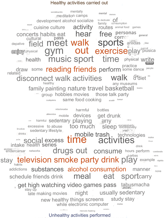 Within the framework of the Innovation and Teaching Improvement Project of USAL for the academic year 2021/2022, titled “Healthy Leisure for University Student Population (ID2021/172)”, a questionnaire of open-ended questions was designed. This questionnaire was based on the methodological guide for the development of a health assets map aimed at health promotion professionals from the Castilla y León Health Council (Consejería de Sanidad Castilla y León, 2022). The purpose was to address the knowledge and perception of USAL student population regarding leisure and free time, as well as the leisure offerings promoted by USAL. Furthermore, its construction is supported by Kretzmann & McKnight (1993), who identify five dimensions for the construction of health and education asset maps, based on reflection on two approaches: abundance and scarcity: