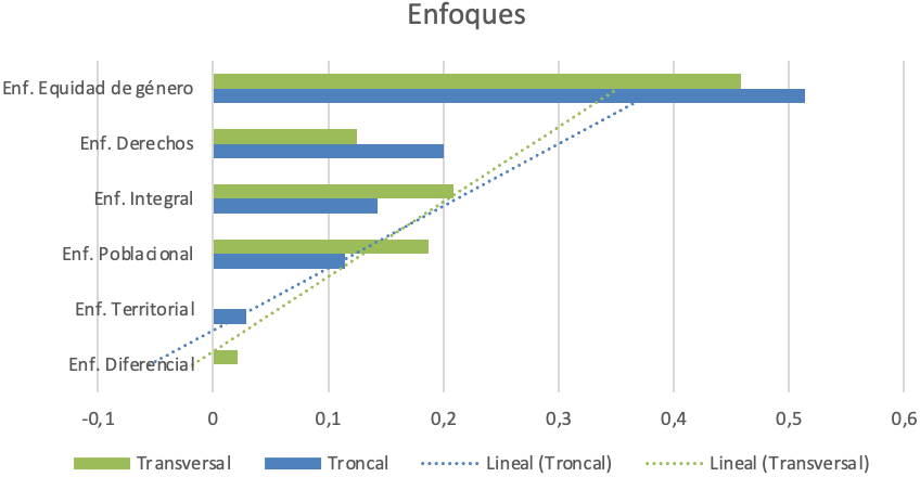 Adicionalmente, los programas se caracterizan por atender a las articulaciones nacionales con los objetivos de desarrollo sostenible a través de políticas y planes que se operacionalizan en el plan de desarrollo departamental en líneas que enmarcan los programas desde enfoques; siendo mayoritario el enfoque de equidad de género en el abordaje de la intervención socioeducativa de las violencias estudiadas, lo cual es coherente con las políticas multilaterales de ODS, las políticas nacionales, y las normativas. Sin embargo, dejan un saldo pendiente a la congruencia con la cosmovisión de los pobladores ancestrales a través de un enfoque territorial y diferencial que mínimamente se tuvo en cuenta, lo que corrobora la ausencia de una variable étnica dentro de la planeación presente para la región.