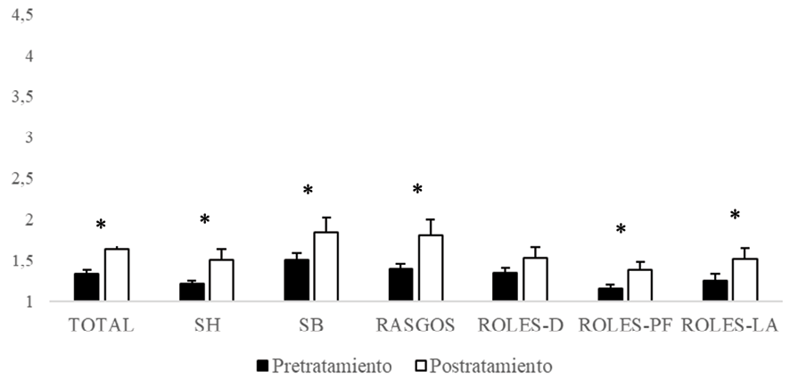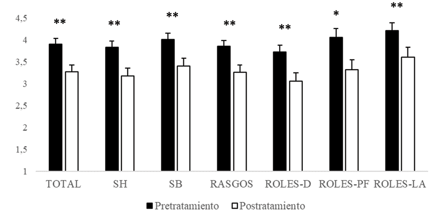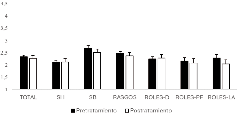 Respecto a las subescalas complementarias, la puntuación media pretratamiento en la subescala de Rasgos fue de M = 2.58 ± 0.11; en la subescala Roles-D (estereotipos acerca de la asignación a las mujeres de tareas domésticas y de cuidado) la puntuación media pretratamiento fue de M = 2.44 ± 0.12; en la subescala Roles-FP, que evalúa la preferencia por la asignación de roles públicos y de generación de recursos a los hombres, la puntuación media pretratamiento fue de M = 2.47 ± 0.14; por último, en la subescala Roles-LA, que mide la legitimación de la autoridad masculina sobre la mujer, la puntuación media fue de 2.60 ± 0.14 (Tabla 1).