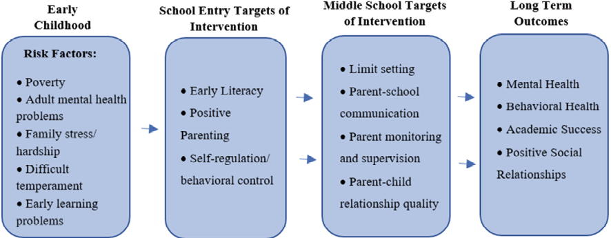 Guided by a developmental model of adaptation and risk behavior, the FCU is grounded in literature that focuses on parenting practices and family relationships as the core protective factors for preventing mental health distress and the later development of problem behavior through adolescence (e.g., Fosco et al., 2012). Decades of developmental research confirm that family relationships and parenting skills are key intervention targets that reduce mental health distress and problem behavior in youth and, if delivered as prevention during early childhood, school-age, or adolescence, these interventions are effective at sustaining long-term improvements in mental health into the adult years (Connell et al., 2023; Figure 2). Contextual stress and early risk factors, such as poverty, stressful life events, adult mental health problems, and early learning and behavior problems, directly limit parents’ ability to use effective parenting strategies at home. Parenting skills, including positive and proactive parenting, predict self-regulation and behavioral control as children enter school. Self-regulation skills, in turn, predict school adjustment, including school engagement, reductions in problem behavior, positive social relationships, and academic achievement. These targets lead to improved behavioral routines, and ultimately to positive high school outcomes, such as graduation and successful transition to work or college (Fosco et al., 2016; Garbacz et al., 2018). Parenting skills and family relationships, therefore, offer a potential solution in terms of defining a target for intervention and prevention across development, as has been done with the FCU model (Dishion & Stormshak, 2007; Stormshak et al., 2019). This developmental model of adaptation and risk behavior indicates improving parenting skills and family relationships can reduce the negative impact of contextual stress on children by enhancing child self-regulation skills and behavioral health, thereby increasing adaptation across the lifespan.