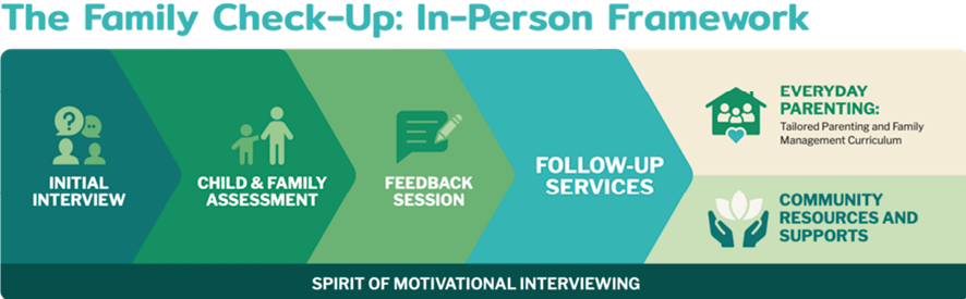 The FCU, originally developed to reduce substance use, problem behaviors at school, and academic problems in middle– and high-school populations (Dishion & Stormshak, 2007), was first evaluated in 1995 in a randomized controlled trial that was delivered in middle school (Dishion et al., 2003). Since that time, 100’s of studies have demonstrated the FCU’s effects across the lifespan, with significant effects on multiple mental health and behavioral outcomes (e.g., Hails et al., 2024; Lundgren et al., 2023; Piehler et al., 2024). Guided by Miller and Rollnick’s (2002) original Motivational Interviewing model, the FCU was developed as a strength-based approach designed to motivate parents to consistently use effective parenting strategies. The FCU is a second-generation intervention, rooted in the Parent Management Training–Oregon Model developed at Oregon Social Learning Center (Dishion et al., 2016), and conceptually linked to many other behavioral parent training programs, including The Incredible Years (Webster-Stratton & Reid, 2018), Triple P (Sanders, 1999), and Multisystemic Therapy (Henggeler & Schaeffer, 2016), with a foundation in behavioral parent training that forms the core curricula. However, unlike these programs, the FCU was intentionally developed as a “check-up” enabling uptake in a range of health care systems that support child mental health, with the goal of delivering brief interventions to reduce risk and support change. The FCU was also developed as an assessment-driven pre-intervention tool that precedes parenting training, with the goal of motivating caregivers to engage in parenting support that is specifically focused on their strengths and self-identified areas of concern. The FCU in-person program begins with three steps: an initial interview, an assessment, and a feedback session. The initial interview focuses on eliciting information about the family context and family strengths and concerns, using motivational interviewing strategies. The assessment includes questionnaires and videotaped family interaction tasks to gather additional information about the family. The feedback session combines information gathered from the initial interview and assessment, which is then used to discuss parent goals. The feedback session is designed to foster motivation, help parents understand their strengths and areas of growth, and connect families to appropriate resources to meet their individualized needs, which might include parenting skills training and support (Connell et al., 2023; Stormshak & Dishion, 2009). Typically, after the feedback session, the Everyday Parenting curriculum (EDP; Stormshak et al., 2024) is used to foster parenting skills. The choice of parenting skills is tailored to the family and their goals. Some key components that define the FCU model are included in Figure 1, such as the use of motivational interviewing, assessment-driven feedback, cultural responsivity, and parent skills training that is grounded in research.