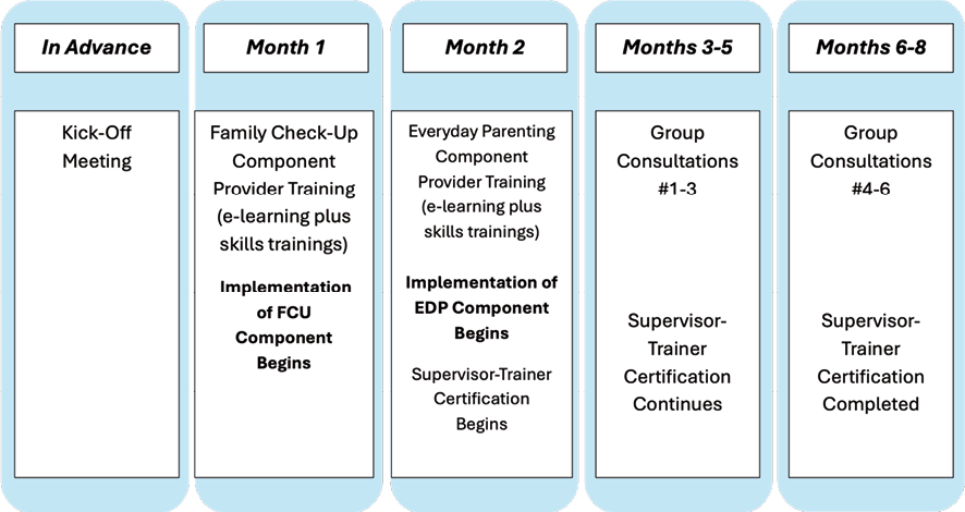 In the preparation phase, an implementation team is assembled. The team includes an implementation coordinator and expert consultant from the NPS implementation team and lead administrators, supervisory staff, and providers from the implementation site; one of the team members from the implementation site, usually agency leadership, is the liaison between the NPS implementation team and the implementation site. The site acquires and allocates required fiscal, space, and technology (e.g., video equipment) resources. Implementation benchmarks and a corresponding timeline are established; benchmarks include training dates and anticipated number of providers trained in the model with specified target dates (i.e., rate of adoption). The training includes an initial self-paced e-learning program supplemented with four 3-hour virtual webinars or in-person trainings. Training involves didactic content presentation, which is effective for transferring knowledge, and enactive training methods (e.g., behavioral rehearsal, role-play, modeling) for skills acquisition. A component of the training focuses on the transfer of technological skills (e.g., process for conducting videotaped interaction tasks) required to use the FCU with fidelity.