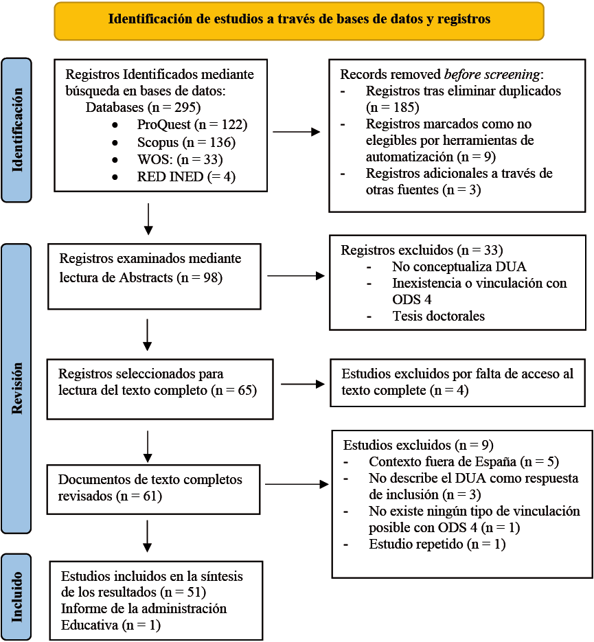 En la segunda fase, se diseñó un plan de cribado y selección de estudios mediante la revisión de los resúmenes de los 295 registros recuperados. Se seleccionaron aquellos que abordaban el problema de investigación y presentaban un enfoque metodológico-práctico del Diseño Universal para el Aprendizaje (DUA), estableciendo una posible relación con las metas del Objetivo 4 de los ODS en España. Se excluyeron nuevamente las tesis doctorales, textos sin rigor científico, propuestas no implementadas y libros o capítulos inaccesibles. Como resultado, 61 documentos cumplieron con los criterios de inclusión y fueron seleccionados para su análisis.