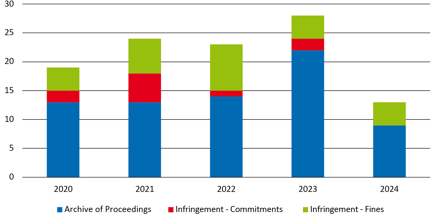 The five-year period can be divided into two distinct phases. The first half saw a clear upward trajectory in the number of antitrust decisions issued, culminating in a record 28 decisions in 2023. However, this number sharply decreased in 2024, with only 13 decisions, less than half the number from the previous year. From an enforcement perspective, 2021 was the most prolific year for the authority, with 11 infringement decisions (including both fines and commitments) and 13 closures of proceedings. In that year, infringement decisions accounted for 45% of all decisions, marking an 11-point increase over the five-year average of 34%.