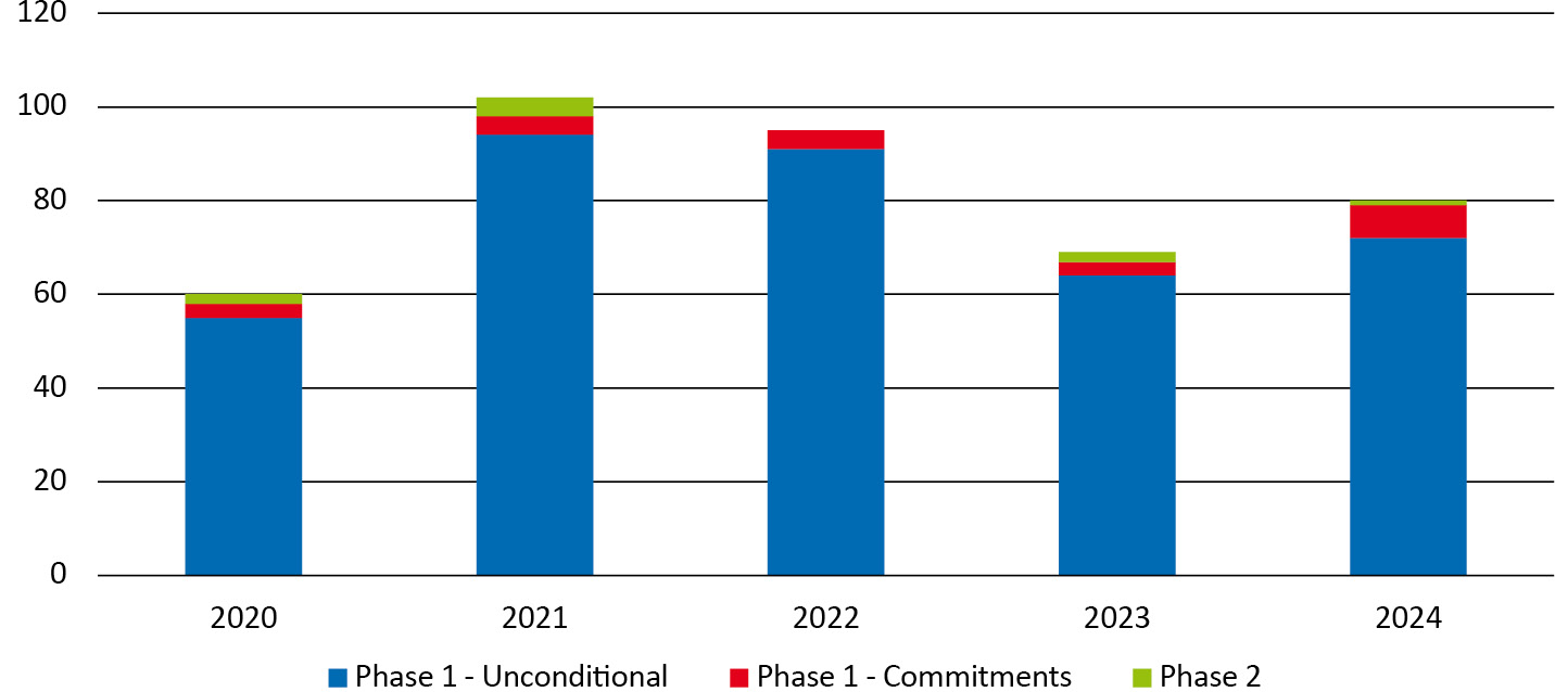 The majority of these decisions were unconditional approvals, with the percentage consistently remaining well above 90%. Notably, 2022 saw a large number of clearances but no Phase 2 decisions, while 2024 experienced the smallest percentage of unconditional clearances, dropping to 90%.