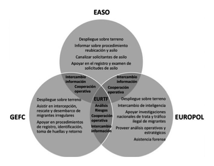 El mandato de Frontex radica fundamentalmente en apoyar a las autoridades nacionales para que gestionen eficazmente sus fronteras exteriores; el de Easo, en asistir a los Estados miembros en la aplicación eficaz y uniforme del SECA, y la misión de Europol se centra en apoyar a los Estados miembros en la lucha contra las formas de delincuencia que afecten a un interés común protegido por una política de la UE. Si bien los mandatos de Frontex, Easo y Europol parecen a priori claramente delimitados, estas agencias asisten a los Estados miembros en ámbitos como, por ejemplo, la llegada repentina y excepcional de flujos migratorios mixtos en la frontera exterior de un Estado miembro, en los que el mandato de las tres agencias se ve afectado. Ante esta situación, puede optarse por no promover ningún tipo de cooperación entre Frontex, Easo y Europol y que cada agencia asista por separado al Estado miembro que haya requerido su apoyo operativo. Aunque ante este supuesto de no cooperación Frontex, Easo y Europol serían plenamente independientes y responsables a la hora de desempeñar las tareas de apoyo que les han sido conferidas, la asistencia operativa resultante estaría sujeta a duplicaciones y superposiciones. Ello redundaría en una aproximación inconsistente e insuficiente ante una situación que requiere necesariamente de la cooperación entre las tres agencias.