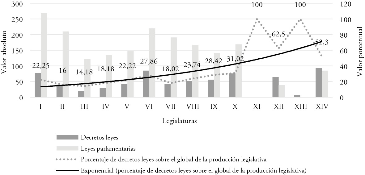 Sin embargo, el incremento estratosférico en el peso del decreto-ley no se debe únicamente al elevadísimo número de decretos-leyes presente en muchas de las legislaturas, sino también al paulatino descenso de la actividad legislativa del Parlamento. De hecho, el máximo histórico de 62,5 % se alcanza en la legislatura XII con 65 decretos-leyes, esto es, 12 menos que en la primera, 11 menos que en la legislatura X (con 76 decretos-leyes que son el 31,02 % de la producción normativa con rango de ley) y 28 menos que en la inacabada legislatura XIV.