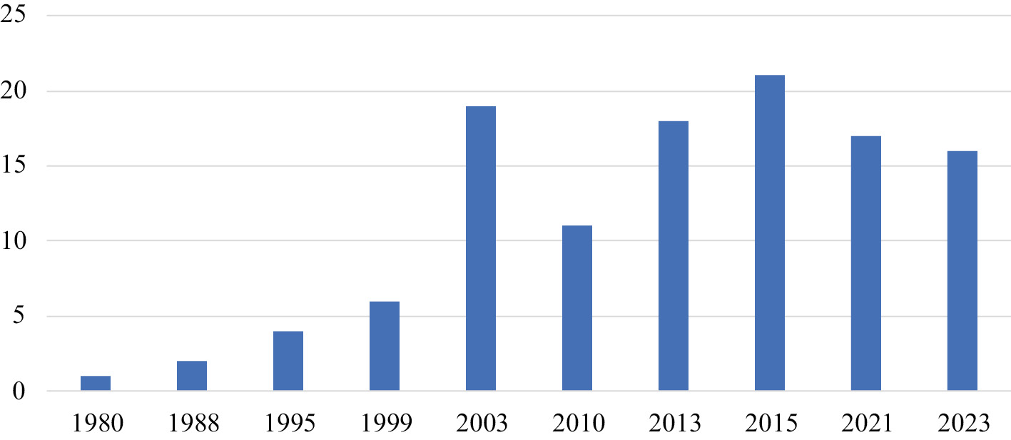 Y no ha sido exactamente así: el número total de leyes dictadas en el período de 2001 a 2023 (1224) ha sido solo ligeramente inferior al del anterior (1460); aunque el de las dictadas en varios de los años del segundo período es muy superior al de las emitidas en la mayoría de los ejercicios del primero (así, en los años 2003, 2007 y 2015 se dictaron más de ochenta leyes). Puede concluirse, pues, que la progresiva sustitución del ordenamiento franquista no ha disminuido apenas el ímpetu normativizador de los sucesivos Gobiernos; o, lo que es lo mismo, que la intensidad de este ímpetu solo se ve levemente condicionada por las transformaciones estructurales que el sistema político pueda sufrir.