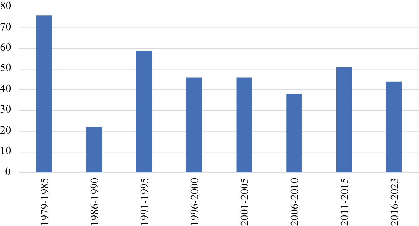 En el plano de la distribución tipológica, resultas chocantes a primera vista tanto el elevado número de leyes orgánicas dictadas en el tiempo de vigencia de nuestra Constitución (384, nada menos) como el similar número de ellas producidas en cada uno de los dos siglos (203 en 1979-2000 y 181 en 2001-2023). Salvo tres excepciones[6], la totalidad de las específicamente previstas en la Constitución[7] fueron dictadas antes del año 2000 (aunque algunas fueron luego íntegramente sustituidas por otras), pero la producción de nuevas leyes orgánicas no experimentó un descenso apreciable, como revela la tabla siguiente.