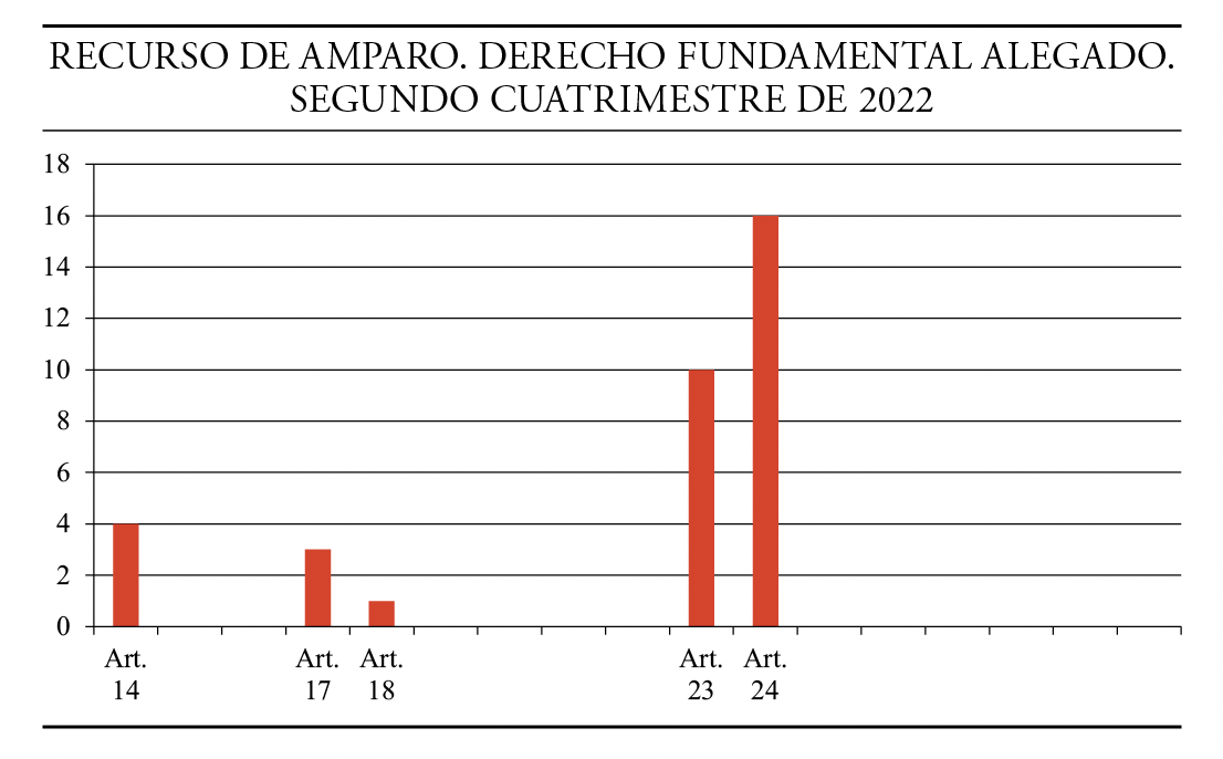 d)Acceso a la jurisdicción: STC 72/2022, de 13 de junio, en la cual se sigue la doctrina de la STC 140/2021; STC 86/2022, de 27 de junio, en la que se aprecia la vulneración por haber denegado la justicia gratuita recurriendo a una interpretación del art. 2.h LAJG restrictiva al reducir el término accidentes del precepto a los accidentes de tráfico, excluyendo, así, otros tipos, como, en el caso, las secuelas derivadas de una negligencia médica.