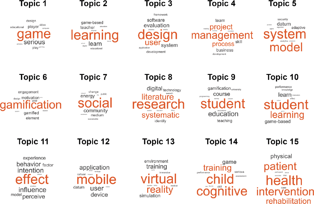 Finally, topic 10 included words such as ‘student’, ‘learning’, ‘game-based’, ‘performance’ or ‘motivation4. When contrasting some of the papers associated with this topic, we found works such as Lei et al., (2022). These authors conducted a meta-analysis to determine the effects of GBP on the academic performance of students from primary school to university in science fields. Their results showed that GBP helps students achieve educational goals to a greater extent than more traditional forms of instruction. Lin et al., (2017) conducted a study comparing the effectiveness of digital GBP on student learning and motivation when used in a competitive or cooperative manner. Their findings indicate that both strategies yielded comparable results in terms of effectiveness and motivation. However, they observed that participants in the competitive mode exhibited greater levels of satisfaction than did those in the cooperative mode. In a study conducted by Hung et al., (2014), the application of GBP in primary school mathematics was found to have a positive impact on students’ performance, self-efficacy and motivation towards the subject. Consequently, the focus of this topic is on the effects that GBP has on the outcome (in terms of efficiency) of the educational process. Additionally, different proposals, competitive or cooperative, and their impact on the variables of educational interest are analyzed. It is important to note that the cooperative or competitive orientation of GBP may be related to the differentiated effects that gamification elements may have on motivation. This is because the character of the game is dependent on the elements that predominate in the game. Therefore, both topics 9 and 10 seem to focus on how GBP can promote learning in the educational environment. These findings may be related to the ‘learning’ theme identified by Rodrigues et al., (2019) or the ‘effectiveness’ theme identified by Martí-Parreño et al., (2016).