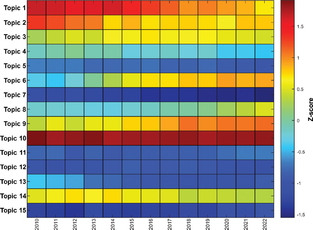 Finally, an analysis of the dynamics of the topics was conducted. To this end, the words that belonged to each topic were searched year by year, and the frequency of occurrence in the documents published was calculated. With the frequency values for each year, Z scores were calculated for each of the topics. The Z score, also known as the Z score, is a statistical measure that indicates the number of standard deviations a particular data point is above or below the mean in a normal distribution. A positive Z score indicates that the value is above the mean, while a negative Z score indicates that it is below the mean. The Z score is used to standardize and compare different datasets.