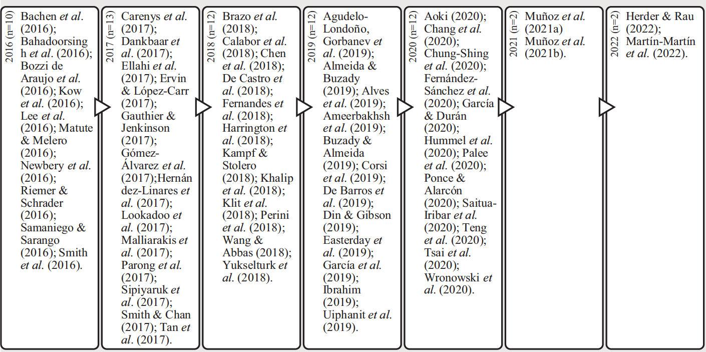 En relación con los criterios de exclusión, se excluyen comunicaciones a congresos, tesis, informes de investigación, capítulos, libros, y publicaciones anteriores al año 2016. Además, no se añaden artículos publicados en idiomas diferentes a los indicados. Por su parte, se excluyen estudios teóricos o propuestas didácticas, en las que no se presenten evidencias empíricas, y revisiones sistemáticas. No se incluyen artículos que hagan referencia a juegos de mesa o juegos no digitales, así como estudios planteados en otras etapas educativas (por ejemplo; Educación Infantil, Educación Primaria, Educación Secundaria, etc.). Para finalizar, no se consideran estudios planteados para la formación del profesorado universitario.