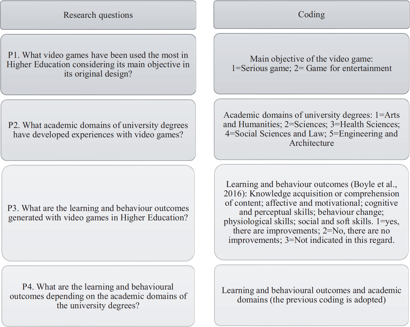 Partiendo del objetivo principal, esta revisión pretende dar respuesta a las cuatro preguntas de investigación de aparecen la Figura I, siguiendo la codificación indicada.