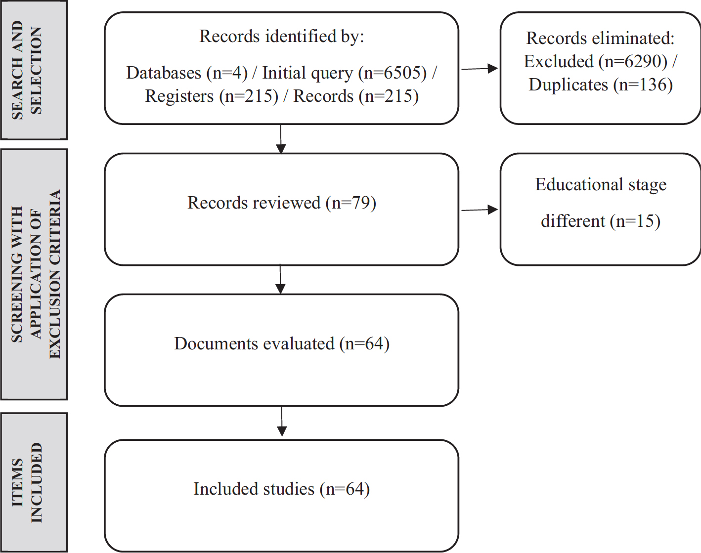 Después, se hace una revisión de documentos por título y resumen, donde se seleccionan 215 artículos, que reúnen los criterios (véase Figura II), y que, por tanto, abordan el uso de videojuegos, presentan resultados de aprendizaje generados con videojuegos, y se plantean en la etapa universitaria. Por su parte, en la tercera fase, se realiza un cribado mediante una evaluación por pares de manera independiente de los documentos, eliminándose 136 documentos duplicados, contando con 79 artículos. En la cuarta fase, se hace una revisión de cada artículo recabado a texto completo, donde se valora la posibilidad de incluirlos en la muestra o rechazarlos, en función de si cumplían o no los criterios de inclusión mencionados y con apoyo de los criterios de exclusión, quedando 64 artículos, que conforman la muestra final de la revisión.