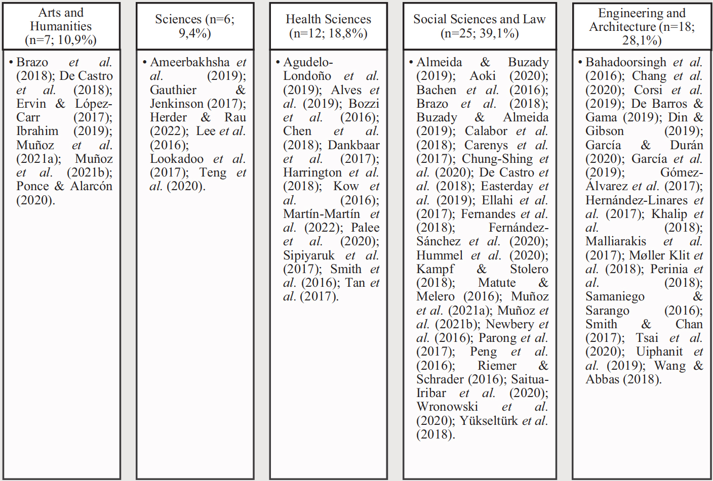Como se aprecia en la Figura IV, la mayor parte de los artículos de la muestra final, pertenecen a las ramas de Ciencias Sociales y Jurídicas (n=25; 39,1%), Ingeniería y Arquitectura (n=18; 28,1%), y Ciencias de la Salud (n=12; 18,8%). A su vez, el menor número de estudios proviene de Artes y Humanidades (n= 7; 10,9%), y de Ciencias (n= 6; 9,4%). La mayoría de los estudios se centran en titulaciones de una rama de conocimiento, si bien, 4 estudios (Brazo et al., 2018; De Castro et al., 2018; Muñoz et al., 2021a, 2021b) se implementan en dos ramas de titulaciones diferentes. Al igual que Boyle et al. (2016), se considera que los juegos permiten trabajar aprendizajes sobre diferentes temáticas en diferentes campos.