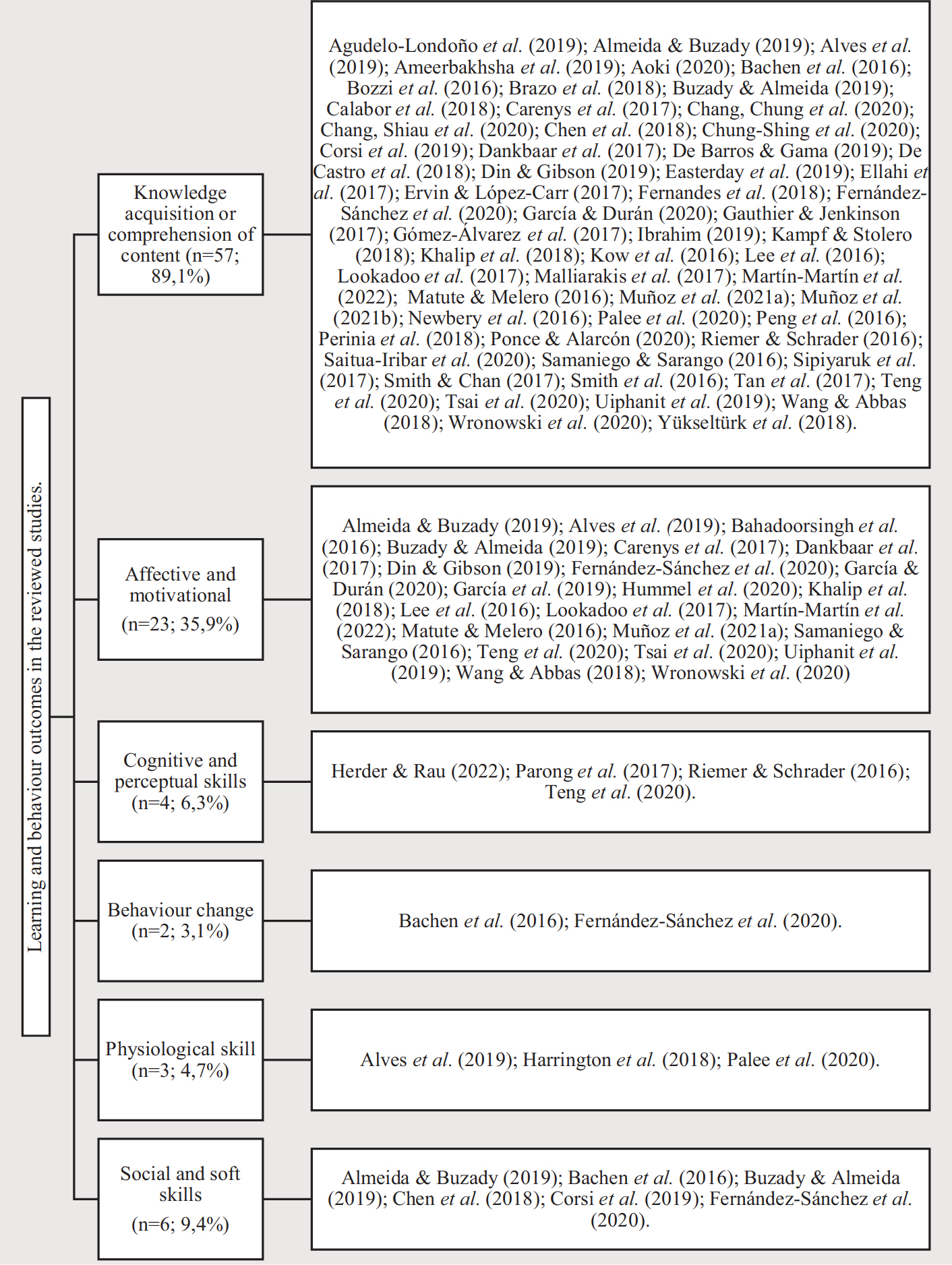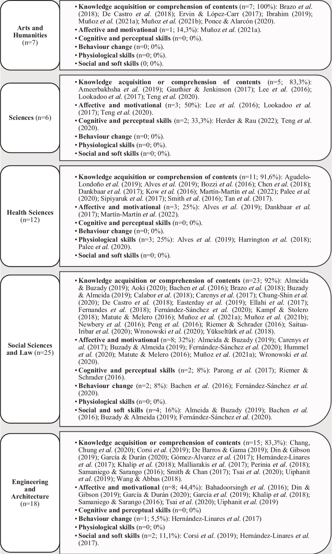 A su vez, cada rama presenta estudios con otros resultados de aprendizaje. En el caso de Ciencias, se localizan 2 estudios con resultados de aprendizaje referidos a habilidades cognitivas y perceptuales (33,3% del número de estudios de Ciencias). Por su parte, en Ciencias Sociales y Jurídicas hay variedad de resultados, además de los ya señalados. En este sentido, se localizan 4 estudios con resultados referidos a habilidades sociales y blandas (16% sobre los estudios localizados de esta rama), así como 2 referidos a habilidades cognitivas y perceptuales, y 2 estudios de cambio de comportamiento en cada caso (8% sobre los estudios de Ciencias Sociales). Asimismo, no se localizan estudios referidos a habilidades fisiológicas. Finalmente, en Ingeniería y Arquitectura, además de lo ya mencionado, también encontramos 2 estudios con resultados de aprendizaje y comportamiento asociados a habilidades sociales y habilidades blandas y 1 a cambio de comportamiento (11,1% y 5,5% respectivamente sobre los estudios de esta área de conocimiento). En general, se coincide con Boyle et al. (2016) en la obtención de resultados de aprendizaje positivos mediante la aplicación didáctica de videojuegos en educación, particularizando en nuestro caso en la etapa universitaria.