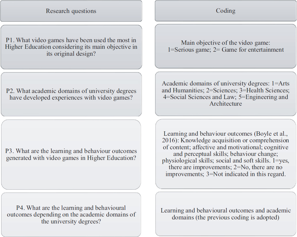 Data collection, extraction and analysis in this SLR are based on the coding of relevant aspects of studies on the use of video games in university education with which the assessed papers were aggregated in a database created specifically for this research. In the research database, the papers were indexed according to the source database and search keywords in a folder containing the full-text papers. Thus, specific information could be pulled from the papers, such as source database, language, author's full name, year of publication, scientific journal and author's reference data. The complete coding of the final sample of papers can be downloaded via the following link: https://doi.org/10.5281/zenodo.10656904