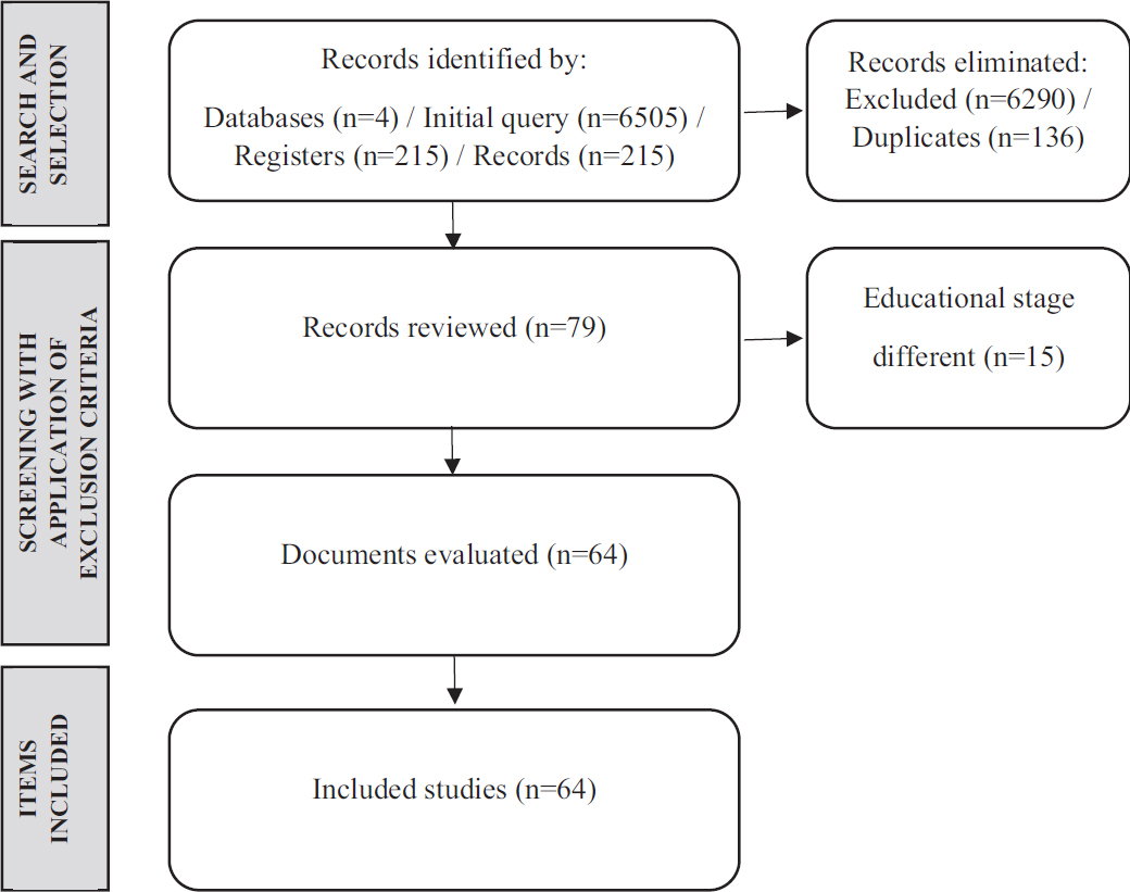 Due to the extensive volume of papers on the use of video games in education, Boolean operators were used to filter searches, incorporate terms with quotes and use the AND and OR operators. Specifically, the search terms for video games or digital games in English, Spanish and Portuguese were: «serious game» or «digital game» or «videogame» or «video game» or «game-based learning» or «educational game» or «computer games»; «serious game» or «juego digital» or «videojuego» or «juego serio» or «game-based learning» or «juego educativo» or «juegos de ordenador»; «serious game» or «jogo digital» or videojogo» or «jogo sério» or «game-based learning» or «jogo educativo» or «jogo educacional» or «jogo de computadora». These concepts were searched together with the following terms related to university education (depending on the language): «higher education» or «undergraduate» or «postgraduate»; «educación superior» or «universitario» or «postgrado» or «posgrado»; «educação superior» or «universitário» or «mestrado» or «pós-graduação».