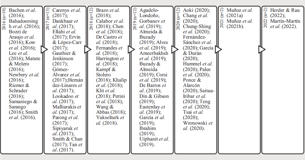 Regarding the exclusion criteria, theses, books, book chapters, conference papers, research reports and studies published before 2016 were excluded. In addition, papers published in languages other than those indicated were not included. Furthermore, theoretical studies and didactic proposals in which no empirical evidence is presented and systematic reviews were excluded. Research papers that refer to board games or non-digital games, as well as studies conducted on educational stages other than university (e.g., early childhood education, primary education, secondary education), were not included. Finally, studies aimed at training university faculty were not considered.