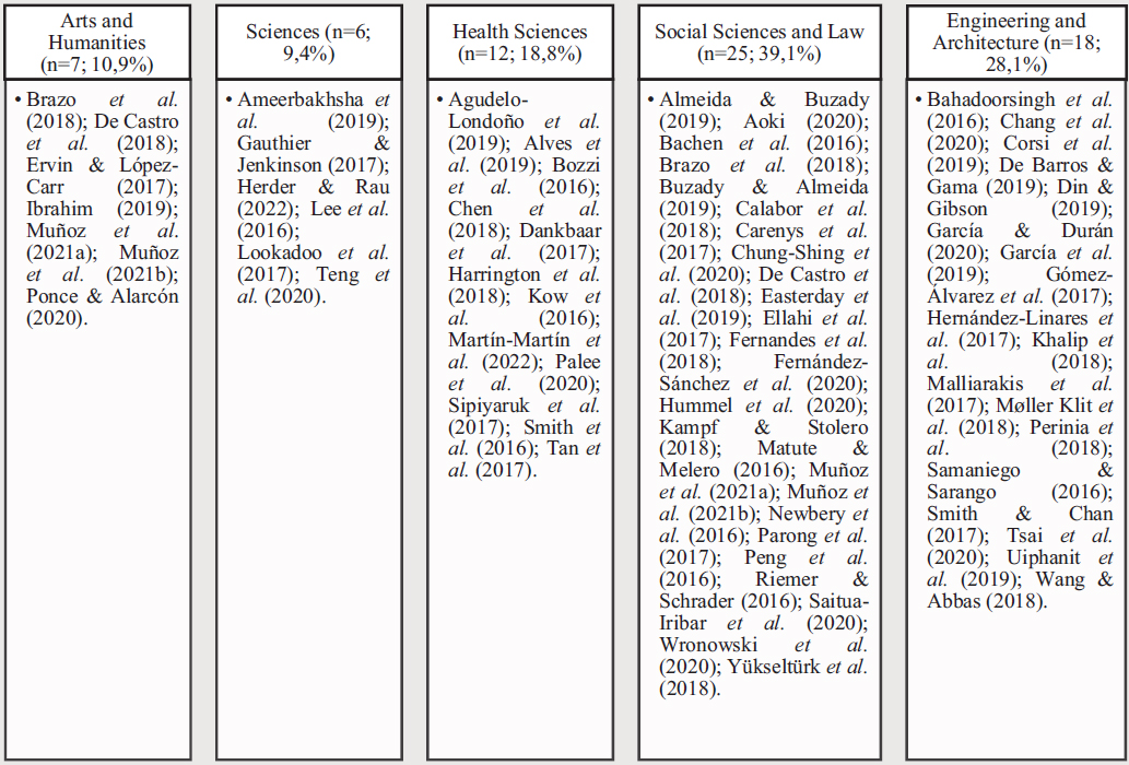 As seen in Figure IV, the majority of the papers in our final study sample fall under the following domains: the Social Sciences and Law (n = 25, 39.1%), Engineering and Architecture (n =18, 28.1%), and the Health Sciences (n = 12, 18.8%). Conversely, the smallest number of these studies fall under the Sciences (n = 6, 9.4%) and the Arts and Humanities (n = 7, 10.9%) domains. Most of the reviewed studies focus on students pursuing degrees within a single academic domain; however, four studies (Brazo et al., 2018; De Castro et al., 2018; Muñoz et al., 2021a, 2021b) span two different academic domains. Similar to the conclusions drawn by Boyle et al. (2016), these reviewed studies conclude that games facilitate learning across different themes and various fields.