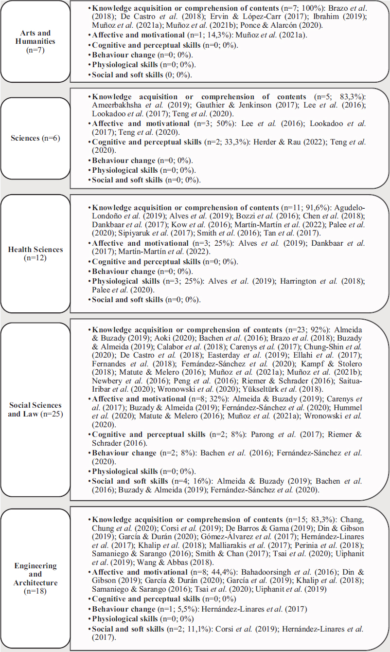 Furthermore, there are studies with other learning outcomes in each academic domain. In the case of the Sciences, there are 2 studies with learning outcomes related to cognitive and perceptual skills (33.3%). Under the Social Sciences and Law, a variety of learning outcomes are investigated in addition to those already mentioned. In this sense, there are 4 studies with outcomes related to social skills and soft skills (16% of the studies within the Social Sciences and Law domain), as well as 2 related to cognitive and perceptual skills and 2 on behaviour change in each case (8% of the studies in the Social Sciences). However, none of the reviewed studies investigate physiological skills. Finally, in Engineering and Architecture, in addition to what has been mentioned, there are also two studies with learning and behaviour outcomes associated with social skills and soft skills and one on behaviour change (11.1% and 5.5%, respectively). In general, this coincides with the findings of Boyle et al. (2016) regarding the achievement of positive learning outcomes through the pedagogical application of video games in education; however, our study focuses on university education.