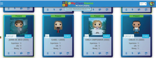 En primer lugar, en cuanto a la instrucción, es necesario explicar las diferencias entre ambos grupos en lo que respecta a la gamificación. Por un lado, en el grupo control se aplicó una gamificación superficial basada en elementos de gamificación que incluyeron puntuaciones y tablas de clasificación. Los estudiantes de este grupo también se representaron a sí mismos con avatares de personajes históricos, asignados al azar a cada participante. Por otro lado, el grupo experimental llevó a cabo una instrucción utilizando gamificación profunda. En este grupo, además del uso de puntos y tablas de clasificación, los participantes utilizaron avatares creados por ellos mismos y la gamificación contó con una narrativa relacionada con la Historia que intentaba dotar de sentido a toda la experiencia. Así, las actividades desarrolladas no se percibían aisladas como en el grupo control, sino que se veían como un conjunto de actividades que tenían un objetivo específico. Se utilizó la plataforma “MyClassGame” para realizar un seguimiento del progreso de ambos grupos. Esta plataforma permite a estudiantes y profesores identificarse con un personaje, reflejando los puntos y avances que realizan. La Figura I muestra una ilustración de esta plataforma con los nombres de los estudiantes anonimizados.