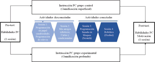 En cuanto a la instrucción gamificada, se compuso de cuatro sesiones de sesenta minutos, en las que se presentó a los participantes una variedad de actividades desconectadas y conectadas. El método utilizado se basó en una perspectiva mixta: dos sesiones consistieron en actividades desconectadas y dos sesiones consistieron en actividades conectadas, que fueron las mismas para ambos grupos. La única diferencia entre el grupo de control y el experimental radicaba en los elementos de gamificación mencionados anteriormente.