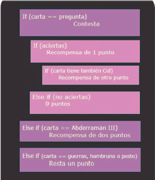 La segunda actividad de esta segunda sesión tuvo como objetivo trabajar el concepto de “condicionales” en programación. Con ese propósito, se diseñó un juego de cartas relacionado con conceptos históricos. Los participantes debían crear sus propias reglas con las cartas proporcionadas utilizando instrucciones escritas en lenguaje de programación en bloques. Los objetivos que perseguía esta actividad fueron:
