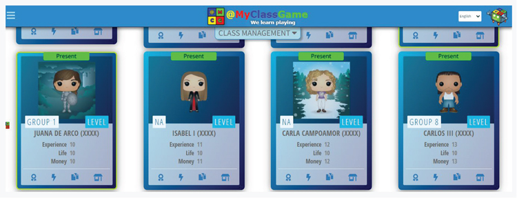 Firstly, concerning the instruction it is necessary to explain the differences between both groups in terms of gamification. Regarding the control group (in which shallow gamification was applied), the gamification elements were, mainly, points and leader boards. Students from this group also used avatars from historical characters to represent themselves that were randomly assigned to each participant. The experimental group, however, carried out an instruction using deep gamification. Therefore, in addition to the points and leader boards, they used avatars created by themselves and the gamification had a narrative related to History that tried to link the whole experience together. This way, the activities developed were not perceived isolated as in the control group, but they were seen as a group of activities that had a specific goal. The “MyClassGame” platform was used to track the progress of both groups. This platform allows students and teachers to identify themselves with a character, reflecting the points and advancements that they carry out. Figure I shows an illustration of this platform with the students’ names anonymized.