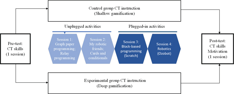 Based on the main research questions of this study, a quasi-experimental design with two groups (control and experimental) was proposed. Both groups carried out a CT gamified instruction but they used different types of gamification. Specifically, the control group experienced shallow gamification for that instruction, whereas the experimental group experienced the same instruction by applying deep gamification to it. The differences between both groups are better explained in the procedure section.
