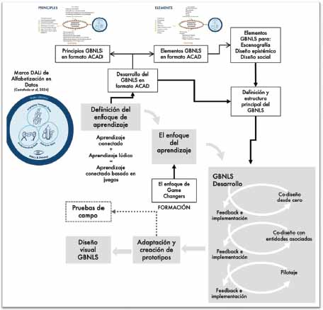 La investigación basada en diseño es un proceso de diseño participativo que se ha definido en cuatro pasos, que pueden ocurrir como una secuencia o en paralelo (Gros, 2019): el análisis del contexto, el diseño participativo, el diseño del producto y el prototipo como hipótesis. Adaptando estos pasos, el consorcio inició un proceso de co-creación de las GBNLS que sigue cinco fases principales: