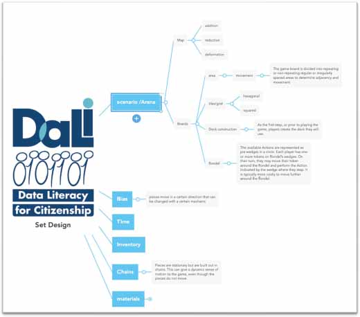 A cada equipo se le encomendó la tarea de diseñar dos GBNLS. Cada GBNLS incluía un subelemento del Marco de Alfabetización en Datos como objetivo de aprendizaje, este objetivo se indicaba de antemano. Los equipos podían incluir más de un subelemento o nivel en el juego, pero para garantizar la cobertura del espectro de la Alfabetización en Datos, el especificado era obligatorio y tenía que ser el principal. Todos los juegos creados en DALI tenían como objetivo desarrollar el nivel básico (nivel A) del Marco de Alfabetización en Datos DALI (tabla I).