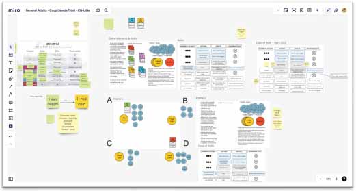 En total, fueron 5 equipos de co-creación (4, uno para cada grupo objetivo, y un equipo dirigido a grupos intergeneracionales), que trabajaron en línea mediante sesiones de videoconferencia (a través de Zoom), documentos compartidos (a través de Google Drive) y correo electrónico. Algunos de los grupos centralizaron su trabajo en los tableros del MIRO, como puede verse en la figura VIII.