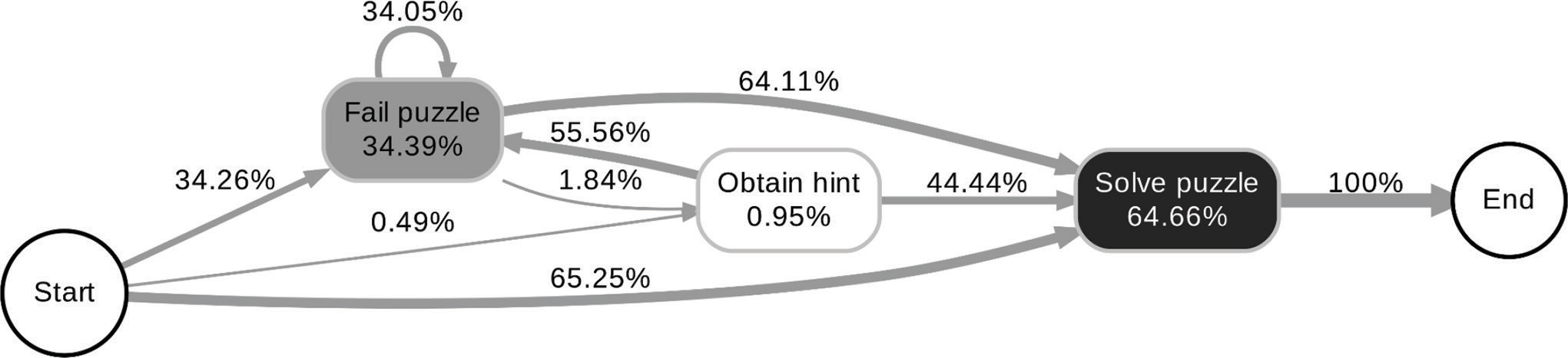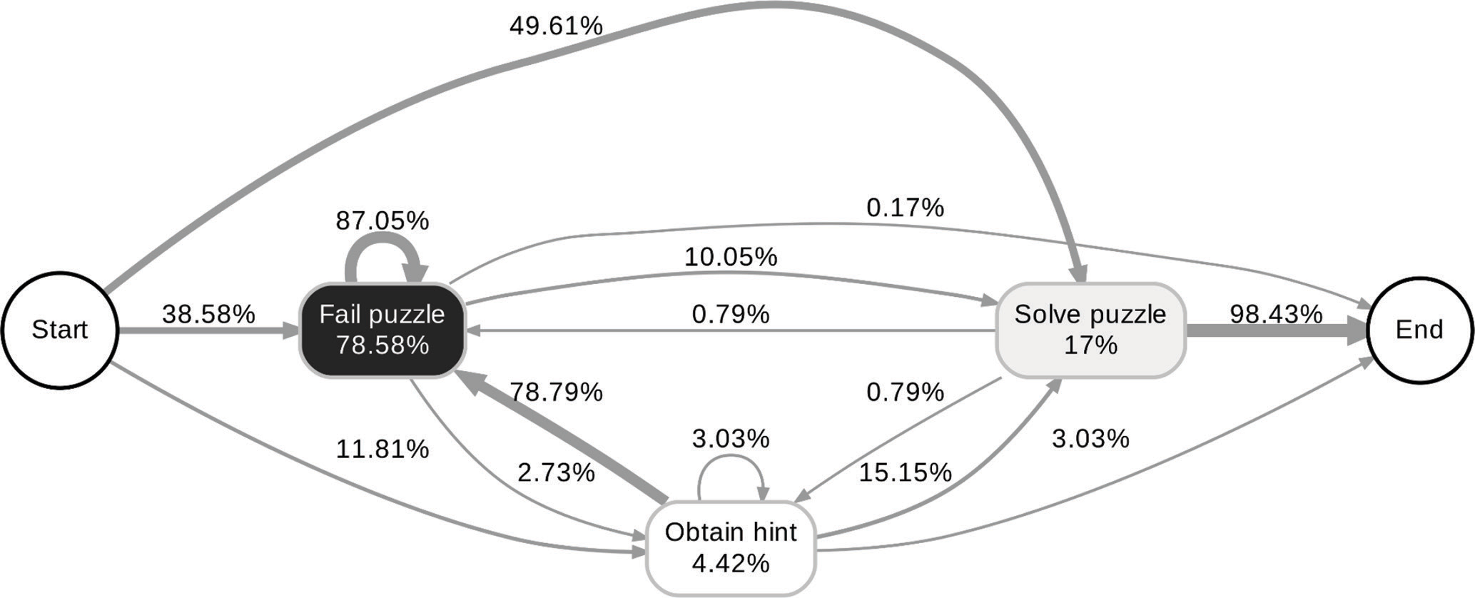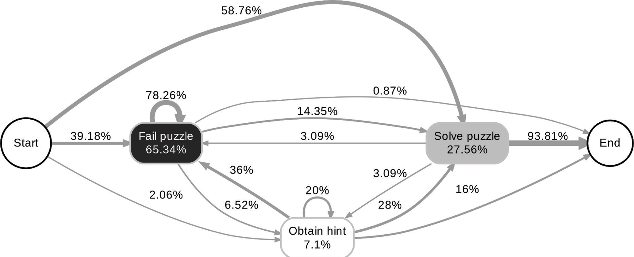 La Figura 1 muestra el mapa de procesos del escape room de la asignatura de lengua española. En casi la mitad de los casos, los estudiantes (49,61 %) logran llegar a la solución correcta de un reto directamente, mientras que el 38,58 % de las veces, los estudiantes comienzan proporcionando una solución incorrecta. Solo el 11,81 % de las veces los estudiantes piden una pista antes de intentar resolver el reto. Los intentos fallidos de reto a menudo se dan uno detrás del otro, ya que un intento fallido conduce a otro el 87,05 % de las veces. Solo el 11,81 % de las veces los estudiantes recurren a pedir una pista después de proporcionar una solución incorrecta al reto. Además, las pistas llevan a alcanzar la solución correcta el 15,15 % de las veces, y una solución incorrecta el 78,79 % de las veces.