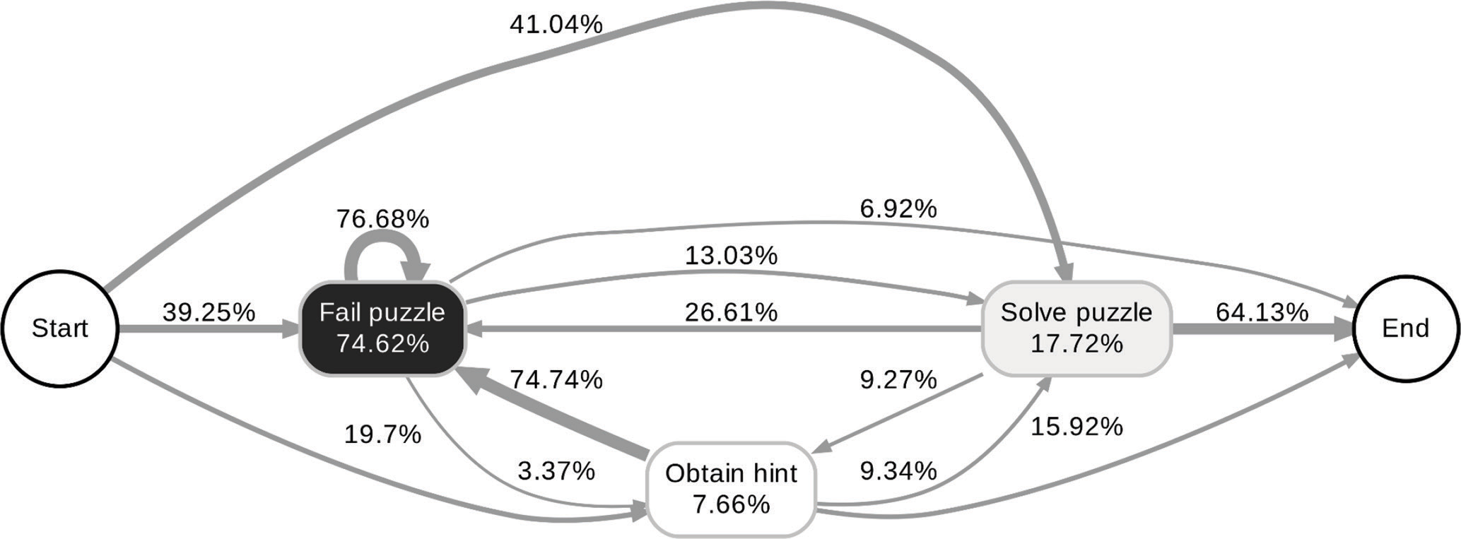 Los mapas de procesos ofrecen una imagen más clara de la temporalidad y la interacción de los juegos analizados. El nodo “Inicio” indica que un jugador comienza a trabajar en un reto, y el nodo “Fin” que deja de trabajar en un reto, ya sea porque lo ha resuelto correctamente o porque el tiempo se ha agotado. Los nodos restantes representan los tres eventos registrados durante el juego de los estudiantes y están anotados con la proporción del número total de eventos que representan. Una flecha entre el nodo A y el nodo B representa una transición entre el evento A y el evento B, y está anotada con el porcentaje que esa transición representa de todas las transiciones con origen en el nodo A.
