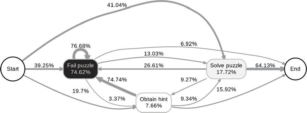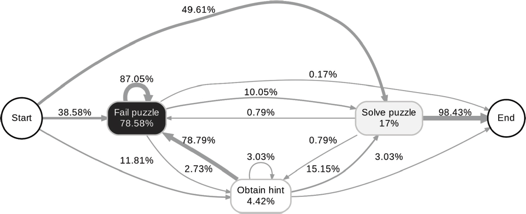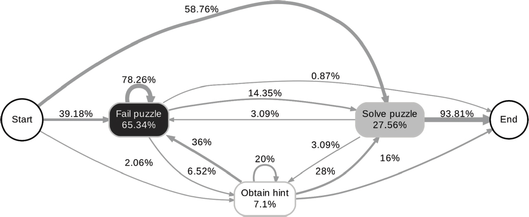 Figure I shows the process map of the Spanish language escape room. In almost half of the cases, students (49.61%) are able to reach the correct solution of a puzzle directly whereas, 38.58% of the times, students start by providing a wrong solution. Only 11.81% of the times students ask for a hint before attempting to solve the puzzle. Failed puzzle attempts often come in a row, since a failed attempt leads to another one 87.05% of the times. Only 11.81% of the times students resort to asking for a hint after providing a wrong solution to the puzzle. Moreover, hints lead to reaching the correct solution 15.15% of the times, and a wrong solution 78.79% of the times.