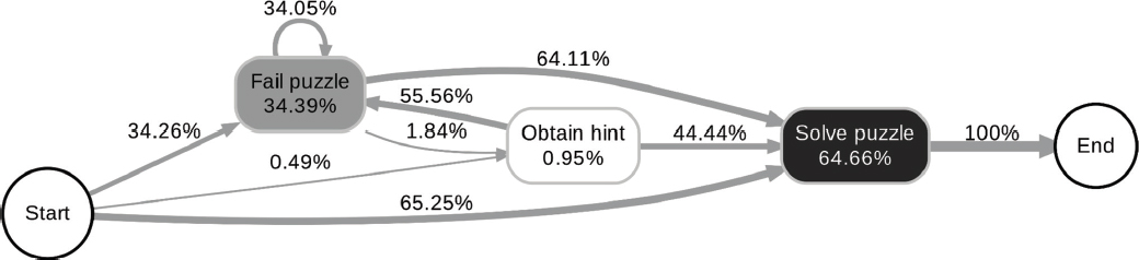 The process maps paint a clearer picture of the temporality and interplay of the recorded gameplay events. The “Start” node indicates a player starting to work on a puzzle, and the “End” node that they cease to work on a puzzle, be it because they have solved it correctly or because the time is up. The remaining nodes represent the three events recorded during students’ gameplay and are annotated with the share of the total number of events they represent. An arrow between node A and node B represents a transition between event A and event B, and is annotated with the percentage that transition represents out of all the transitions with origin in node A.