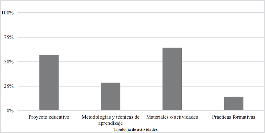 Atendiendo a la tipología de acciones realizadas en el ámbito de la educación formal, de acuerdo con la totalidad de los programas incluidos en el citado 63,3%, el diseño y uso de materiales educativos o actividades de aula esporádicas es la opción más frecuente (64,3%), seguida por el desarrollo de proyectos educativos con una programación y objetivos claros (57,1%), la definición de metodologías o técnicas de aprendizaje (28,6%) y finalmente por la ejecución de prácticas formativas (14,3%) (Gráfico I).