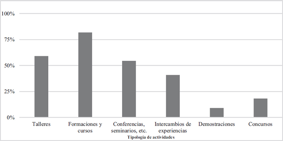 Esta última actividad es precisamente aquella más repetida entre las acciones del ámbito no formal (81,8%), las formaciones y cursos, y le sigue una de parecida, los talleres (59,1%), así como seminarios o congresos (54,5%) e intercambios de experiencias (40,9%). A pesar de no tratarse de programas educativos, todos consideran oportuno incluir alguna iniciativa de transmisión del conocimiento, siendo aquello más valorado las formaciones, aunque no dispongan de un diseño claro, como ya se ha especificado. Uno de los proyectos analizados, el de la salvaguarda de la cultura del carrillón belga, incorpora prácticamente todas las tipologías analizadas, demostrando así la potencialidad educativa del patrimonio y el interés de lo pedagógico en la cultura. El patrimonio debe ser valorado como algo más que un recurso didáctico para las Ciencias Sociales y las instituciones deben considerar a la educación como una parte fundamental para la gestión sostenible de las expresiones.