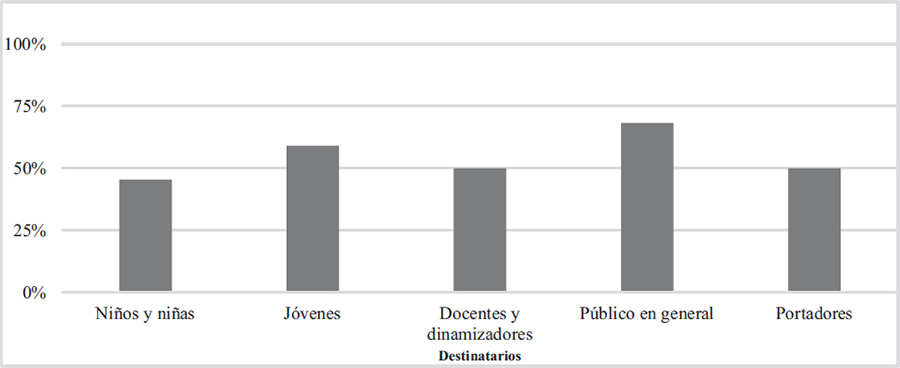 Los destinatarios de las actividades del contexto no formal son el público en general (68,2%), con un porcentaje cercano los jóvenes (59,1%), los docentes y dinamizadores culturales (50%), los portadores (50%) y los niños (45,5%). Es interesante resaltar que en los programas de los últimos años las iniciativas van destinadas a todas o casi todas las tipologías, hecho que demuestra una concienciación por parte de los impulsores. A pesar de que los portadores presentan un porcentaje no muy elevado, no debe resultar preocupante pues entre los jóvenes y el público en general se encuentran futuros portadores de las tradiciones.