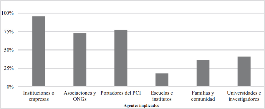 En lo que concierne a los agentes implicados en el diseño e implementación de las buenas prácticas, se evidencia la necesidad de tener una o varias instituciones, empresas o asociaciones que se vinculen al proyecto. En la totalidad de los casos disponen de algún o varios ejemplos. Cabe destacar igualmente que en el 77,3% de los informes se cita a los portadores como implicados, sean o no los destinatarios directos, lo que cumple con lo recomendado por la UNESCO y los estudiosos del PCI en el sentido de que toda acción debe desarrollarse con el conocimiento, permiso y la participación de los protagonistas. Esta vinculación mejora el enfoque y los contenidos, en definitiva, la calidad del proyecto educativo (Ballesté et al., 2021; Ballesté et al., 2022).