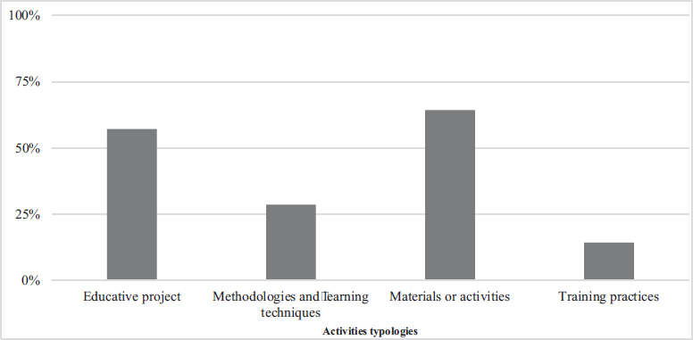 In terms of the type of actions carried out in the field of formal education, according to all the programmes included in the aforementioned 63.3%, the design and use of educational resources or sporadic classroom activities is the most frequent option (64.3%), followed by the development of educational projects with clear programming and objectives (57.1%), the definition of learning methodologies or techniques (28.6%) and finally by the execution of training practices (14.3%) (Graph I).