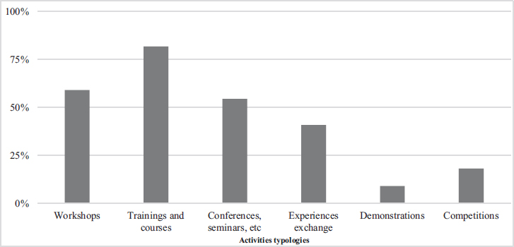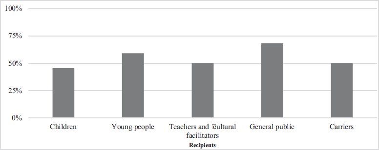 The target groups of the activities in the non-formal context are the general public (68.2%), closely followed by young people (59.1%), teachers and cultural facilitators (50%), carriers (50%) and children (45.5%). It is interesting to note that in the programmes of the last few years, the initiatives are aimed at all or almost all typologies, a fact that demonstrates an awareness on the part of the promoters. Although the percentage of carriers is not very high, this should not be a cause for concern, as there are future tradition carriers among young people and the general public.