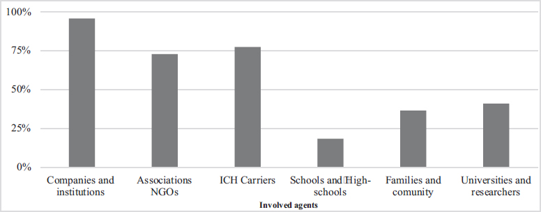 With regard to the agents involved in the design and implementation of good practices, there is a clear need to have one or more institutions, companies, or associations involved in the project. In all cases they have one or more examples. It is also noteworthy that 77.3% of the reports cite the carriers as being involved, whether or not they are the direct recipients, which complies with the recommendation of UNESCO and ICH scholars in that any action should be developed with the knowledge, permission, and participation of the protagonists. This relationship improves the approach and content, and ultimately the quality of the educational project (Ballesté et al., 2021; Ballesté et al., 2022).
